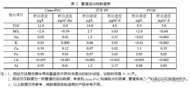 選擇管材的依據(jù)主要是管道的溶出物(見(jiàn)表1)及內(nèi)表面光潔度。主要應(yīng)用的管道有Clean-PVC管、潔凈PP管、PVDF管幾種。Clean-PVC管采用耐沖擊硬質(zhì)聚氯乙烯制造,其比普通PVC管含有較少的添加劑。從而減小了管道內(nèi)壁的粗糙度(Clean-PVC管的表面粗糙度小于0.37 μm,而普通PVC管的表面粗糙度在1.0 μm)以及污染物的析出。制造商主要有“積水國(guó)際貿(mào)易有限公司(SEKISUI)”、“日本旭有機(jī)材株式會(huì)社(ASAHI AV)”。潔凈PP管材質(zhì)為(β)-PP-H均聚型聚丙烯,具有非常均一、致密的結(jié)構(gòu)和出眾的抗沖擊強(qiáng)度。其高結(jié)晶度確保了極好的耐化學(xué)品性能,二氧化鈦色素的使用進(jìn)一步提高了此特性。其內(nèi)壁粗糙度及污染物的析出性能與Clean-PVC接近。制造商主要有喬治.費(fèi)歇爾管路系統(tǒng)有限公司(+GF+)。PVDF管材質(zhì)為聚偏二氟乙烯,是一種高結(jié)晶度,純水設(shè)備高性能熱塑性塑料,可用溫度/壓力范圍廣。其主要特性是力學(xué)強(qiáng)度高、韌性好、具有優(yōu)異的耐磨性、熱穩(wěn)定性和介電性,其純度高,能熔融成型,對(duì)于大多數(shù)化學(xué)品和溶劑都具有很好的耐腐蝕性、抗紫外線和核輻射性能好、耐候性好、耐生物菌類的作用、氣體和液體阻隔性好、阻燃性好、發(fā)煙量少等優(yōu)點(diǎn)。聚偏二氟乙烯是一種純凈的材料,它不含任何添加劑,且其表面光滑,粗糙度小于0.2μm。制造商主要有喬治?費(fèi)歇爾管路系統(tǒng)有限公司(+GF+)、奧地利AGRU公司。
