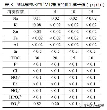 如表2所示,8英寸半導(dǎo)體對(duì)純水水質(zhì)指標(biāo)的要求相當(dāng)嚴(yán)格,Clean-PVC及潔凈PP已不能滿足其要求,而PVDF管道的溶出物及管道內(nèi)壁光潔度都遠(yuǎn)強(qiáng)于Clean-PVC及潔凈PP,故而只能選擇PVDF管道。在國(guó)內(nèi)的半導(dǎo)體生產(chǎn)中也有8英寸采用Clean-PVC管道的成功案例,但經(jīng)過(guò)實(shí)測(cè)分析后發(fā)現(xiàn),這類生產(chǎn)廠的產(chǎn)品都是從6英寸升級(jí)至8英寸的,也就是在6英寸純水管道系統(tǒng)運(yùn)行若干年后升級(jí)為8英寸的,而Clean-PVC管路系統(tǒng)經(jīng)過(guò)長(zhǎng)時(shí)間運(yùn)行后,其溶出的離子呈逐步減少的趨勢(shì)。以某電子廠為例,一期廠房純水系統(tǒng)未設(shè)置專門(mén)的除TOC紫外線燈,僅依靠制備過(guò)程中對(duì)TOC的去除,在運(yùn)行了若干年后,其回水管道TOC可以達(dá)到15ppm,而二期新建的純水系統(tǒng),設(shè)置了專用的除TOC紫外線燈,在系統(tǒng)開(kāi)始運(yùn)行階段的站房出口TOC,也只有50 ppm。正是由于這種特性,所以純水系統(tǒng)在投產(chǎn)前需經(jīng)過(guò)相當(dāng)長(zhǎng)時(shí)間的沖洗運(yùn)行。所以在從6英寸升級(jí)到8英寸的生產(chǎn)中,經(jīng)過(guò)若干年沖洗的Clean-PVC管道也是有可能達(dá)到使用要求的。而PVDF管道可以在短時(shí)間內(nèi)沖洗到較低的指標(biāo),如表3所示。為了節(jié)省初投資,純水回水管道可以采用Clean-PVC或者潔凈PP管代替PVDF,由于純水回水需經(jīng)過(guò)拋光系統(tǒng)的再次處理,所以即使回水中有較多的溶出物也不影響供水的水質(zhì),只是會(huì)影響拋光系統(tǒng)的維護(hù)費(fèi)用,但長(zhǎng)時(shí)間運(yùn)行后維護(hù)費(fèi)用的差別會(huì)逐步減小。