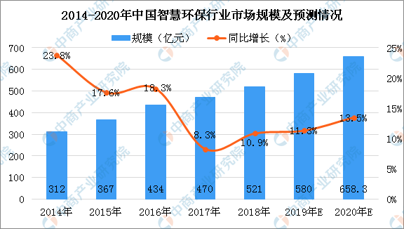 目前,我國環(huán)境污染問題已經(jīng)成為國家和社會關注的焦點,傳統(tǒng)的污染治理方式在預防性、及時性以及精準性等方面有所欠缺。在互聯(lián)網(wǎng)技術快速發(fā)展下,運用大數(shù)據(jù)、云計算和物聯(lián)網(wǎng)等手段智能化治理污染與保護環(huán)境,成為環(huán)保行業(yè)未來發(fā)展的新方向。到2020年,中國智慧環(huán)保行業(yè)市場規(guī)模將突破650億元,市場前景十分廣闊。