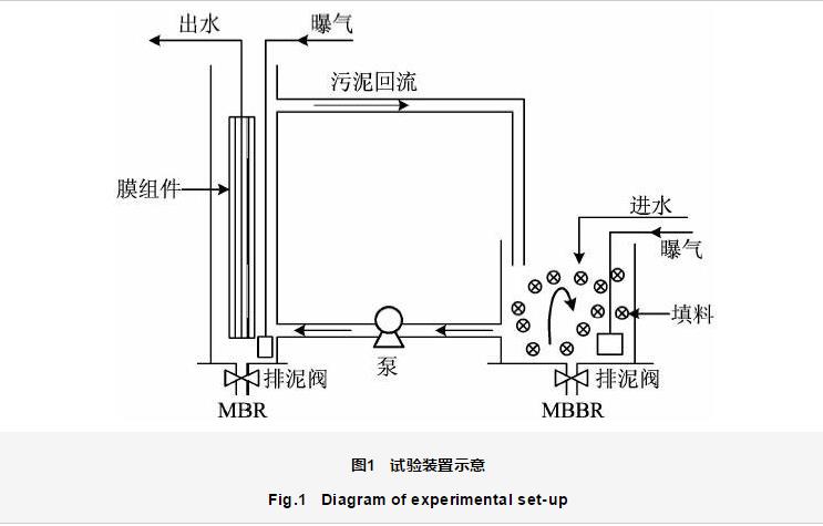試驗(yàn)裝置如圖1所示。整套裝置由MBBR和MBR串聯(lián)而成,總有效容積為7 L。從圖1可以看出,2個(gè)反應(yīng)器均為圓柱形容器,底部均設(shè)有排泥閥,在MBR與MBBR之間設(shè)有污泥回流管道。MBBR中所用填料為直徑15.0 mm的聚乙烯材料,填充比為30%。MBR中膜組件所用膜為中空纖維膜,膜孔徑為0.4 μm,總有效過(guò)濾面積為0.02 m2。MBR和MBBR均設(shè)置了沙球曝氣器,給混合液充氧,使反應(yīng)器中混合液溶解氧(DO)濃度保持在6.0~7.0 mg∕L,曝氣過(guò)程中還可以產(chǎn)生水力剪切力和攪動(dòng)混合液,進(jìn)而減緩膜的污染。曝氣量由玻璃轉(zhuǎn)子流量計(jì)調(diào)節(jié),使其保持在1.0 L∕min。通過(guò)每天排放剩余污泥控制污泥齡(SRT)為80 d,水力停留時(shí)間(HRT)為17 h。反應(yīng)器接種污泥取自北京某污水處理廠。