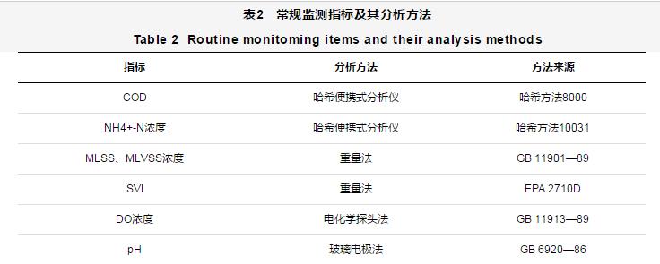 選取NH4+-N濃度和COD作為監(jiān)測(cè)指標(biāo),以反映MBBR-MBR組合工藝的脫氮和對(duì)有機(jī)物的去除效果。試驗(yàn)中常規(guī)監(jiān)測(cè)項(xiàng)目及其分析方法如表2所示。