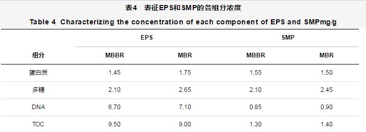 表征EPS和SMP的各組分濃度如表4所示。從表4可以看出,在MBBR和MBR反應(yīng)器中,以TOC表征的EPS濃度最高,以TOC表征的SMP濃度較低。DNA是EPS的重要組分,在MBBR和MBR中濃度分別為6.70和7.10 mg∕g。多糖是SMP重要組分,且MBR中多糖濃度明顯高于MBBR,但蛋白質(zhì)和DNA濃度相差不大。
