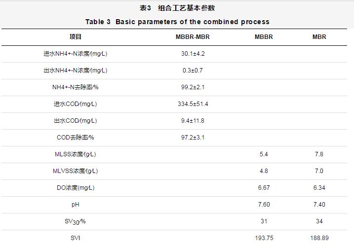 MBBR-MBR組合工藝的基本參數(shù)如表3所示。從表3可以看出,NH4+-N和COD的平均去除率分別為99.2%和97.2%,表明該組合工藝對(duì)NH4+-N和COD均有較好的去除效果。一方面,由于微生物附著生長(zhǎng)在填料表面形成生物膜,曝氣使其處于流化狀態(tài),保證了良好的傳質(zhì)條件,從而實(shí)現(xiàn)了對(duì)污染物的高效去除;另一方面,MBR膜組件的完全截留作用使MBR的污泥停留時(shí)間與水力停留時(shí)間完全分離,同時(shí)保持了反應(yīng)器內(nèi)很高的污泥濃度,使大量硝化菌在反應(yīng)器內(nèi)積累,從而有利于NH4+-N的去除。Shore等[4]驗(yàn)證了MBBR對(duì)NH4+-N有很高的去除率,可達(dá)90%。Wang等[14]采用缺氧∕好氧MBR處理食品廢水,NH4+-N進(jìn)水濃度高達(dá)400~660 mg∕L時(shí),去除率超過(guò)91%。王勇等[15]對(duì)MBR運(yùn)行過(guò)程中活性污泥沉降性能對(duì)膜污染的影響進(jìn)行了研究,結(jié)果表明,隨著污泥容積指數(shù)(SVI)的增大,膜污染平均速率呈增加趨勢(shì),膜過(guò)濾周期逐漸縮短,因此在實(shí)際MBR系統(tǒng)運(yùn)行過(guò)程中,應(yīng)盡可能控制和維持SVI在較低的范圍,以延長(zhǎng)膜污染周期,減少運(yùn)行費(fèi)用。本試驗(yàn)中SVI平均值低于200,總體膜污染情況處于良好狀態(tài)。