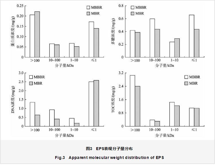 通過(guò)逐級(jí)超濾法對(duì)EPS中各組分進(jìn)行了表觀分子量分級(jí)試驗(yàn),結(jié)果如圖3所示。由圖3可以看出,蛋白質(zhì)以分子量大于100 kDa的大分子量物質(zhì)為主,在2個(gè)反應(yīng)器中的濃度均在0.2 mg∕g以上,占40%~47%;分子量小于1 kDa的物質(zhì)次之,為0.14~0.17 mg∕g;分子量為1~100 kDa的物質(zhì)濃度最低,約為0.1 mg∕g,僅占20%左右。MBBR中小分子量物質(zhì)濃度大于MBR,其余分子量的物質(zhì)濃度相差不大。多糖各分子量的物質(zhì)濃度相差不大,小于1 kDa的小分子量物質(zhì)和10~100 kDa物質(zhì)的濃度接近,為0.5 mg∕g左右,占22%~34%。但在MBBR中小分子量物質(zhì)的濃度明顯高于MBR。DNA的分子量分布規(guī)律和蛋白質(zhì)相反,小分子量物質(zhì)濃度明顯高于其他分子量,在2個(gè)反應(yīng)器中均超過(guò)2.5 mg∕g,且相差不大,占50%左右;而大分子量物質(zhì)濃度和中間分子量物質(zhì)濃度均呈現(xiàn)MBBR中高于MBR。TOC的分子量分布規(guī)律和蛋白質(zhì)基本相同,但其大分子量物質(zhì)濃度更高,在MBBR中達(dá)到了3.0 mg∕g,約占51%,在MBR中也達(dá)到了2.4 mg∕g,約占48%;中間分子量物質(zhì)濃度次之,約為1.5 mg∕g;小分子量物質(zhì)濃度約為1.0 mg∕g,占20%左右。