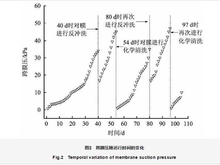 在膜吸壓力初次達(dá)到35 kPa時(shí),進(jìn)行1次反沖洗;待膜吸壓力再次升至50 kPa,接近蠕動(dòng)泵的閾值時(shí)對(duì)膜進(jìn)行化學(xué)清洗,即結(jié)束反應(yīng)器運(yùn)行,取出膜組件沖洗去掉濾餅層,再采用1%的NaClO溶液將其浸泡過(guò)夜,第2天再以清水沖洗。