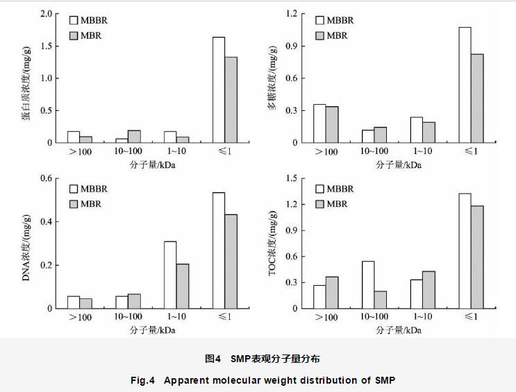 SMP中各組分分子量分布如圖4所示。從圖4可以看出,蛋白質(zhì)的分子量分布以小分子量物質(zhì)為主,其濃度遠(yuǎn)高于其他分子量物質(zhì),在2個(gè)反應(yīng)器中均超過(guò)1.3 mg∕g,約占80%,且MBBR中濃度大于MBR;其他分子量物質(zhì)濃度均較低,不足0.2 mg∕g。多糖的分子量分布規(guī)律與蛋白質(zhì)基本相同,也是以小分子量物質(zhì)為主,占50%以上;中間分子量物質(zhì)濃度與大分子量物質(zhì)濃度較接近,均在0.3 mg∕g左右。DNA的分子量分布也以小分子量物質(zhì)為主,濃度約為0.5 mg∕g,占55%以上;其次是中間分子量物質(zhì),中間分子量物質(zhì)中又以1~10 kDa分子量物質(zhì)為主,占30%左右;大分子量物質(zhì)濃度較低,在MBBR中為0.05 mg∕g,在MBR中濃度更低,僅占6%。TOC的分子量分布與DNA相似,不同分子量的物質(zhì)濃度由高到低依次為小分子量物質(zhì)(占50%以上)、中間分子量物質(zhì)、大分子量物質(zhì)(占20%以下),且MBBR中的大分子量物質(zhì)濃度低于MBR,中間分子量物質(zhì)濃度高于MBR。