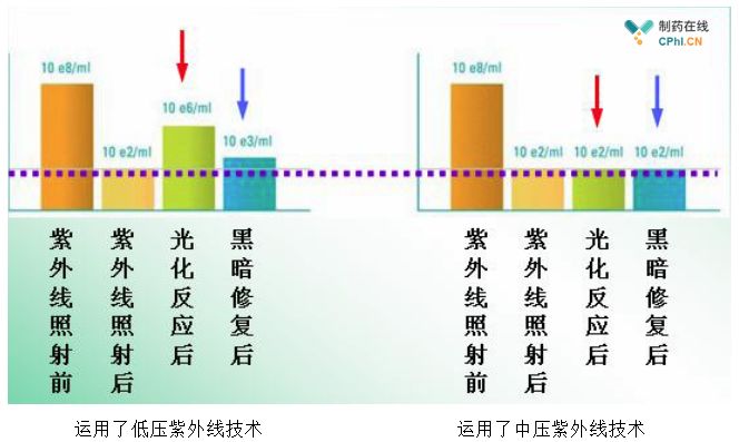從理論方面談,細菌、病菌和病毒長期暴露在太陽光下面(日光中包括紫外線),幾千年的時間,這些細菌、病菌和病毒必然產生對紫外線產生一些抗體,這種抗體在這里被人們稱為活化酶?;罨复嬖谟诩毦筒【募毎麅?,一旦細菌和病菌的DNA 受到損傷,這種活化酶就會發(fā)揮功效,幫助受損部分迅速恢復成原來的狀態(tài)。這樣一個反應過程被稱為細菌和病菌的復活反應,在有光的情況下此種反應能進行的非常迅速 ,但同時也會發(fā)生在黑暗的狀況下。而多譜段中壓紫外線在作用于細菌和病菌的DNA 和RNA 的同時,也作用于這種活化酶,理論上有可能徹底殺滅生長狀態(tài)的微生物 。實際試驗數據也證明了這種理論,2002 年加拿大科學家曾經在實驗室做個這樣一個對比試驗,如圖(4)試驗在完全相同的經低壓和中壓紫外線照射后微生物的光復活的對照試驗
