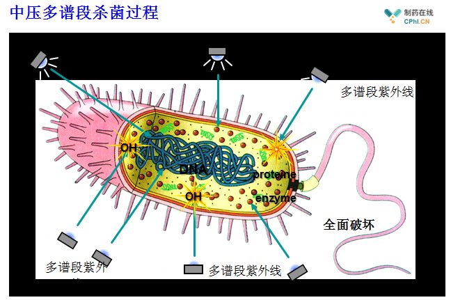 微生物結構,微生物的體內都含有RNA(核糖核酸)和DNA(脫氧核糖核酸),而RNA和DNA的共同特點是具有由磷酸二酯按照嘌呤與嘧啶堿基配對的原則相連的多核酸鏈,它對紫外光具有強烈的吸收作用。紫外線殺菌的原理一般認為它與破壞細胞內代謝、遺傳、變異等現象起著決定性作用的核酸相關,波長在200~300nm之間的紫外線有殺滅作用,其中以254nm波長的紫外線滅菌效果最好。這是因為細胞中的DNA(脫氧核糖核酸)核蛋白的紫外吸收峰值正好在254~257nm之間⑶。