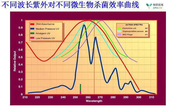 微生物經中壓紫外線照射后不僅破壞DNA還破壞其他組織不同波長紫外線對不同微生物殺菌效率曲線